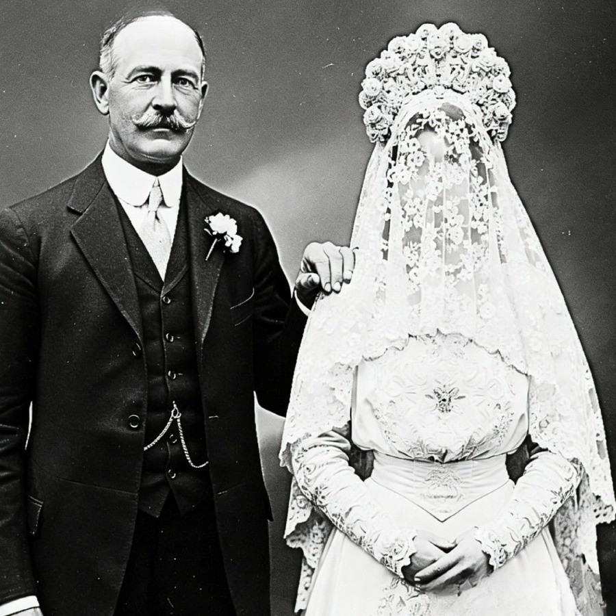 HT9. A 1912 Studio Photo Shows a Bride. When They Zoom in on Her Veil, They Discover a Shocking Truth